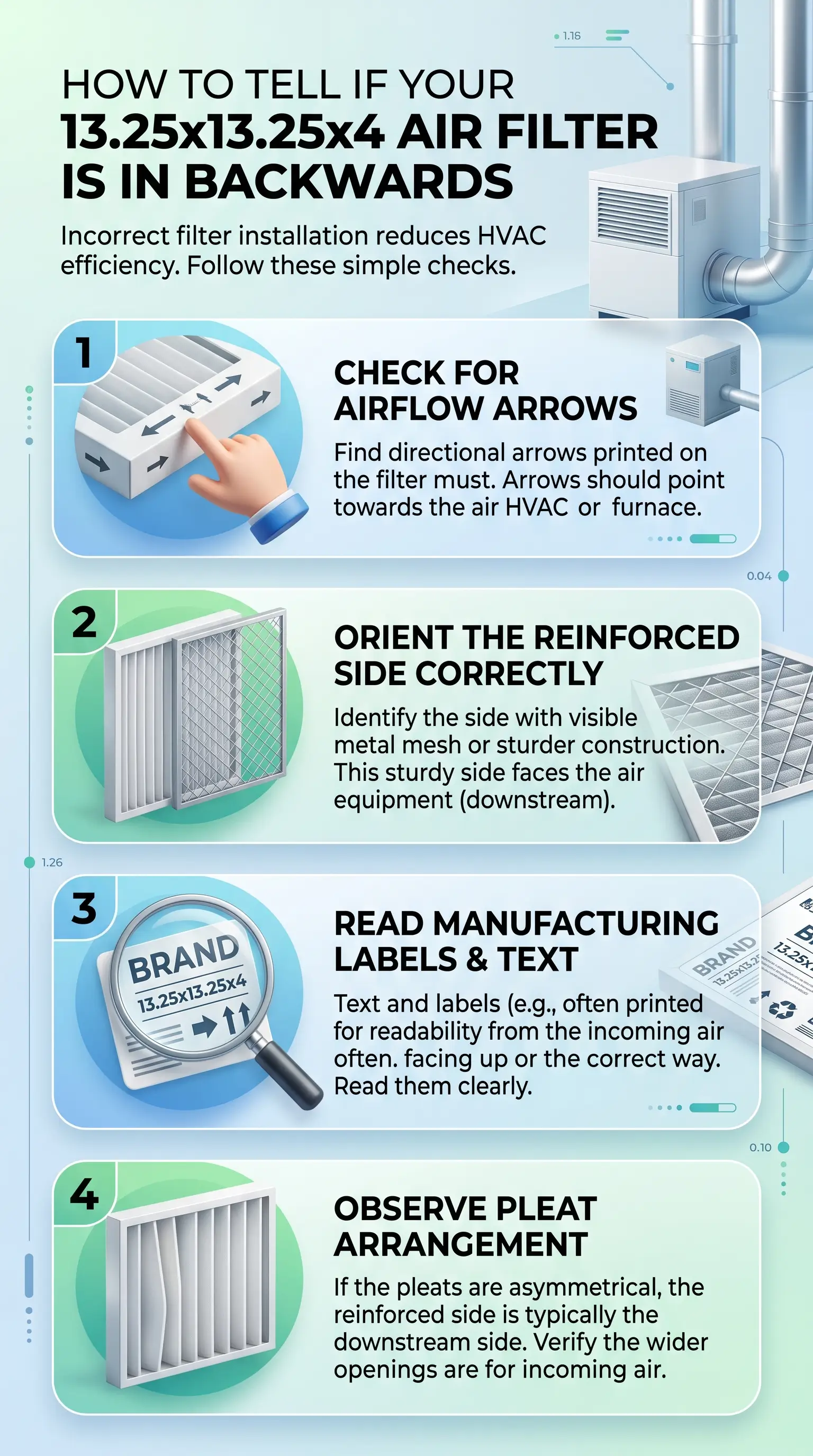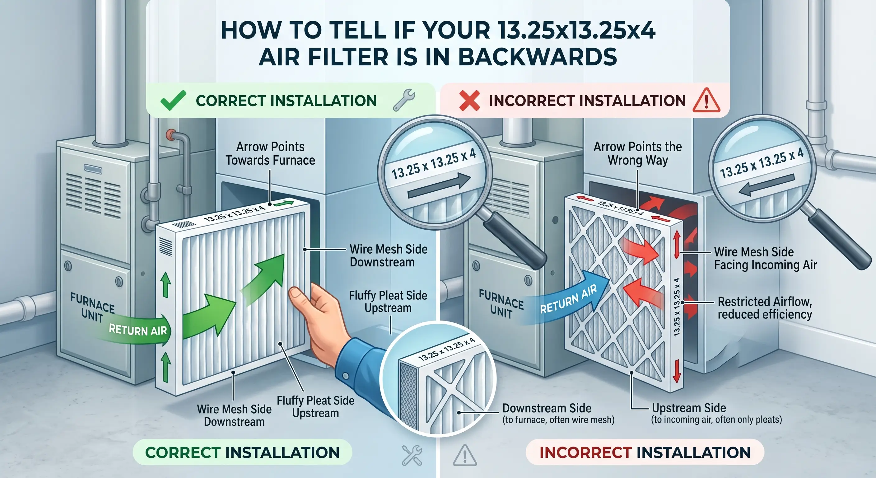 If yours shows damage or you’re already overdue, a set of fresh pleated 13.25x13.25x4 air filters with a clearly printed airflow arrow on the frame will keep you from making this mistake twice.